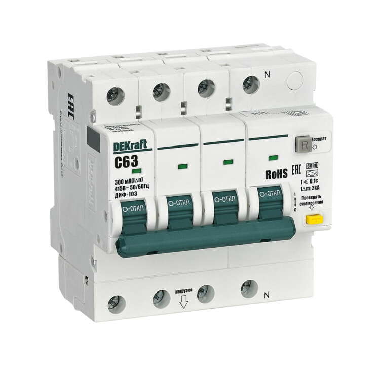 Автоматические выключатели дифференциального тока серии ДИФ-103 6кА NEW Dekraft; 3P+N; номинальный ток 63 А; ном. диф. ток 300 мА; тип диф. расцепителя - A; кривая отключения - С; Icn, Ics = 6 кА; тип устройства - электронный; монтаж – на DIN-рейку. АВДТ обеспечивают три вида защиты - от короткого замыкания, перегрузки и возникновения утечки тока (в частности, вследствие прикосновения человека к токоведущим частям).