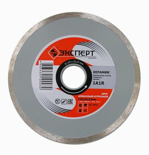 Наружный диаметр: 125 мм, Диаметр посадочного отверстия: 22,23 мм, Максимально допустимые обороты: 12900 об/мин, Максимальная окружная скорость: 80 м/с, Высота алмазоносного слоя: 5 мм, Толщина алмазоносного слоя: 1,8 мм, Материал применения основной: керамика, мрамор