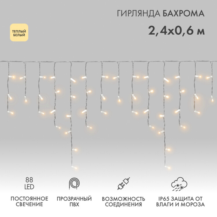 Гирлянда светодиодная Бахрома (Айсикл) 2,4х0,6м 88 LED ТЕПЛЫЙ БЕЛЫЙ прозрачный ПВХ IP65 постоянное свечение 230В нужен блок 303-500-1 NEON-NIGHT (кр. 1 шт)