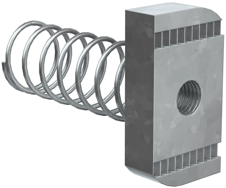 Гайка канальная с удлиненной пружиной предназначена для крепления элементов STRUT-системы между собой, а также кабельных лотков к STRUT-консолям.