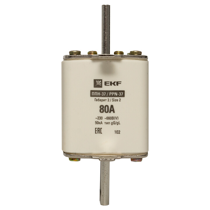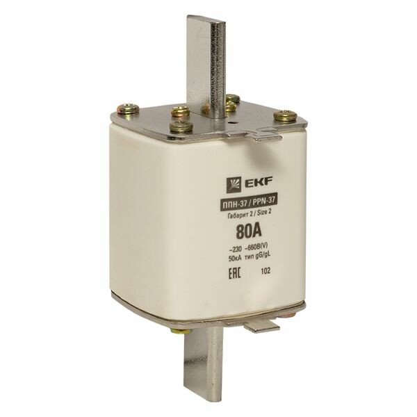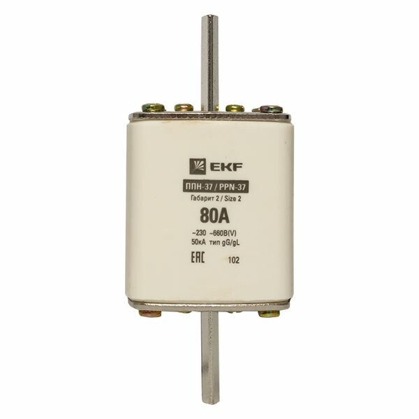 Плавкая вставка ППН-37 400/80А габарит 2 EKF. Предохранители плавкие ППН EKF, укомплектованные плавкими вставками типа gG/gL, предназначаются для защиты кабельных линий и промышленных электроустановок от токов перегрузки и короткого замыкания. Предохранители применяются в электрических сетях переменного тока частотой 50 Гц с напряжением до 660В. Применяются для крепления в распределительных и вводно-распределительных устройствах. Предохранители плавкие ППН могут устанавливаться в основание с держателем, а также в специально предназначенные рубильники. В комплект поставки предохранителей плавких ППН основание с держателем не входит и п риобретается отдельно.