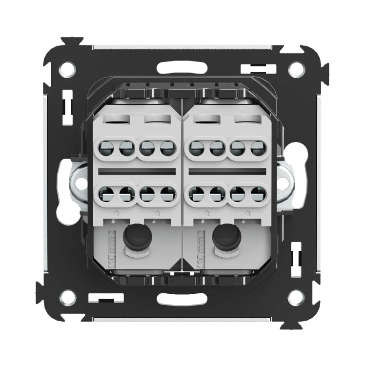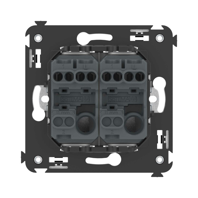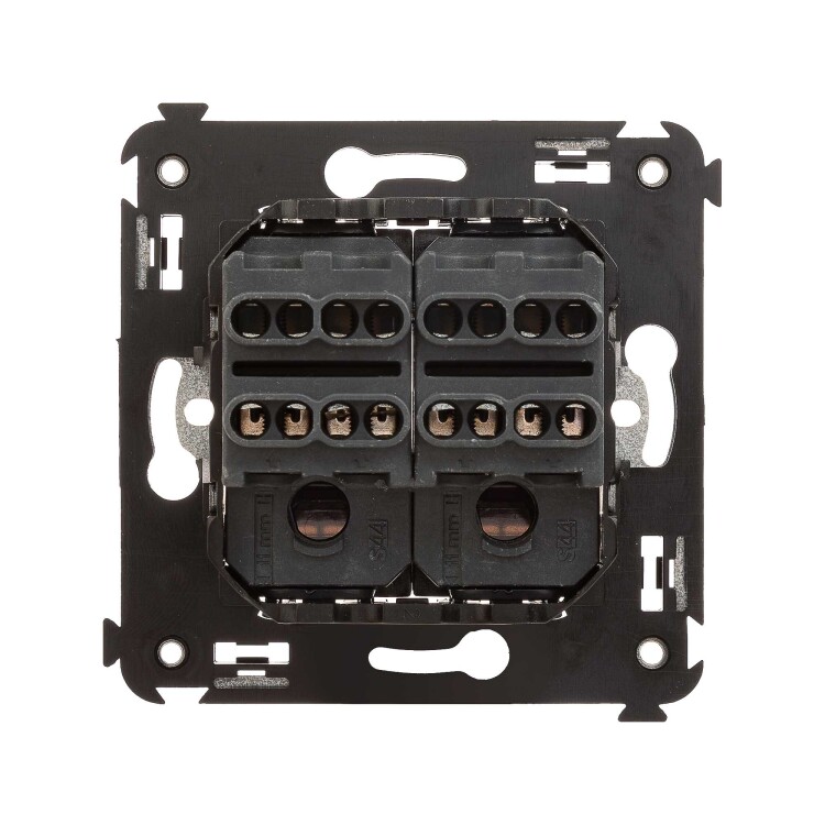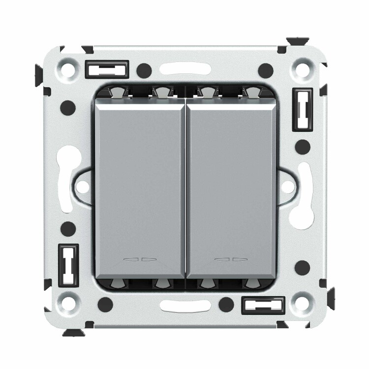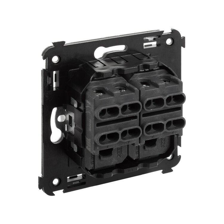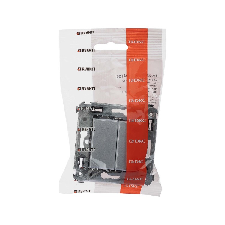 Инвертор двухклавишный. Назначение: для монтажа в подрозеточные коробки глубиной не менее 45 мм (код 59301). Используется для включения/выключения освещения с трех и более мест. Характеристики: 2 модуля, диаметр отверстий для ввода кабелей – 3 мм (по 2 отверстия на одну клемму); винтовые зажимы; фиксация в подрозеточную коробку при помощи саморезов; шаблон для зачистки кабеля – 11 мм; номинальный ток – 16 A; номинальное напряжение – 230 В. Цвет: "Закаленная сталь".