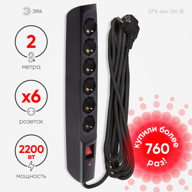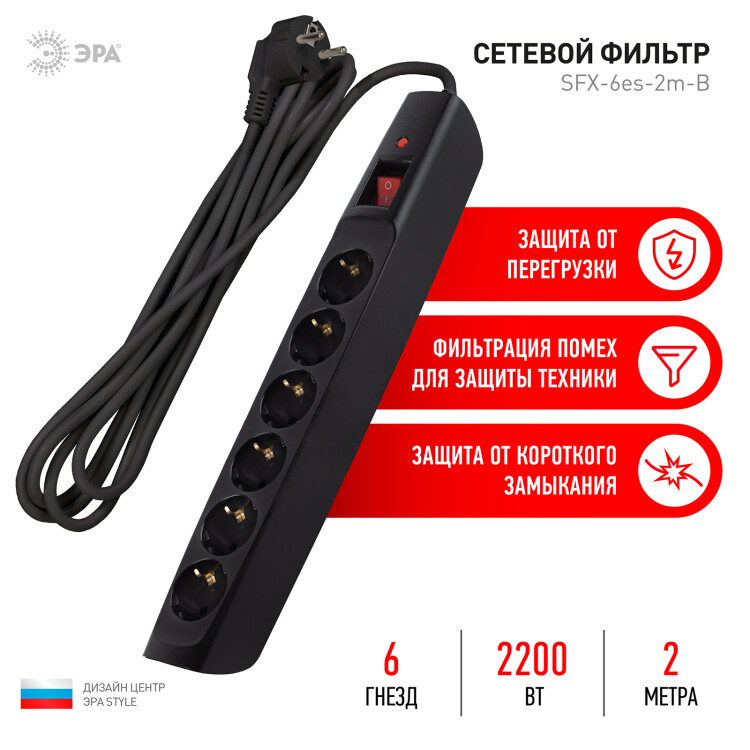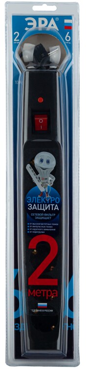 Сетевой фильтр ЭРА SFX-6es-2m-B рассчитан на одновременное подключение большого количества техники. На корпусе расположены 6 розеток с заземлением. Отличительной особенностью модели выступает прочный корпус из негорючего полипропилена, надежный трехжильный провод, терморазмыкатель на 10А, который защищает приборы от перегрузки, а также варистор, конденсатор и дроссель для защиты подключенных устройств от импульсных и высокочастотных помех. На корпусе расположена кнопка выключения. Сетевой фильтр разработан инженерами компании ЭРА, проходит проверку на всех этапах производства, гарантируя высокое качество его исполнения. Длина провода модели составляет 2 метра. Удлинитель удобно использовать в пределах одной комнаты. Сетевой фильтр имеет кольцо на шнуре, благодаря чему прибор можно быстро выдернуть из сети.