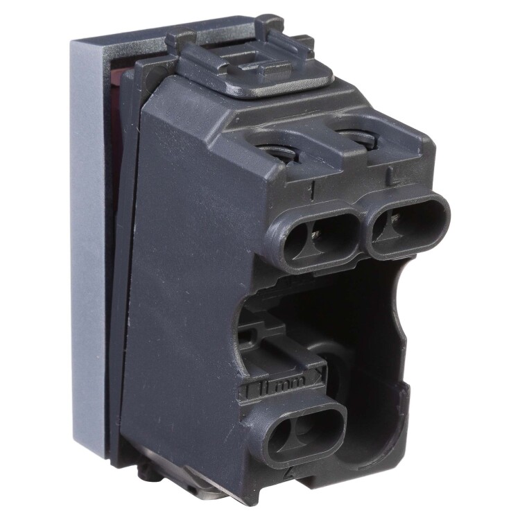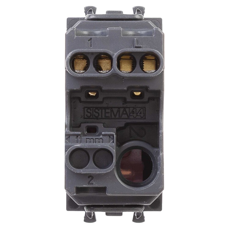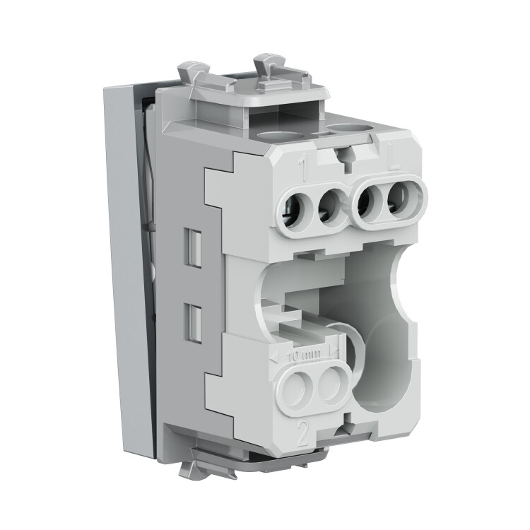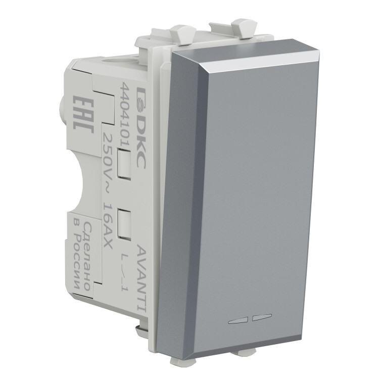 Выключатель одноклавишный однополюсный, модульный. Предназначен для монтажа в систему кабельных коробов «In-liner Front» и систему организации рабочих мест «Сотто» (Sotto) при помощи рамок-суппортов и каркасов «Avanti» (код 4400912 и т. д.); используется для включения/выключения освещения. Характеристики: диаметр отверстий для ввода кабелей — 3 мм (по 2 отверстия на одну клемму); винтовые зажимы; шаблон для зачистки кабеля — 11 мм; номинальный ток — 16 A; номинальное напряжение — 230 В; возможна фиксация в подрозеточные коробки при помощи каркаса с лапками (код 4400802) и саморезов. 1 модуль. Цвет: «Закалённая сталь». Производитель оставляет за собой право вносить во внешний вид изделия изменения, которые не влияют на его функционал, безопасность и надёжность.