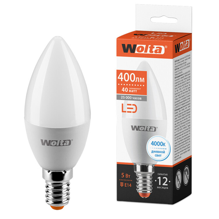 Светодиодная лампа WOLTA 25SC5E14 "Свеча" C37 5Вт 400лм 4000К Е14 1/50 (кр.50шт)