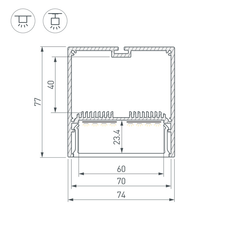 Комплект с экраном. Алюминиевый профиль для светодиодных лент и линеек. Цвет - черный RAL9005 (порошковая окраска). Габаритные размеры (L×W×H): 2500x74x77 мм. Ширина площадки для ленты 60 мм. Отсек для БП 70х40мм. Аксессуары приобретаются отдельно.