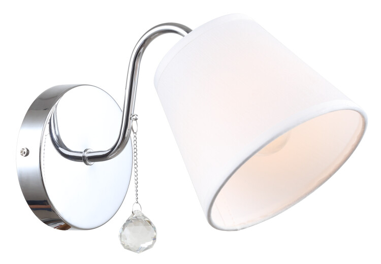 Rivoli Betsy (арт. 2069-401) – классический интерьерный светильник от итальянских дизайнеров. Бра декорировано хрустальной подвеской. Белый тканевый абажур бра напоминает цветочный бутон. Свет бра направлен вниз, что делает этот настенный светильник прекрасным вариантом дополнительной подсветки для чтения, рукоделия, приёма пищи, подготовки ко сну. Металлический корпус данного бра на стену лаконичен и окрашен в трендовый цвет хром. Благодаря хромированию светильник настенный в классическом стиле смотрится актуально в современных интерьерах. Бра Rivoli Betsy применяется с лампочкой Е14 40 Вт и освещает площадь 3 м2. Посмотрите фото другого классического бра с хрустальным декором, представленного в ассортименте Rivoli – арт. 2068-401, Rivoli Bet.