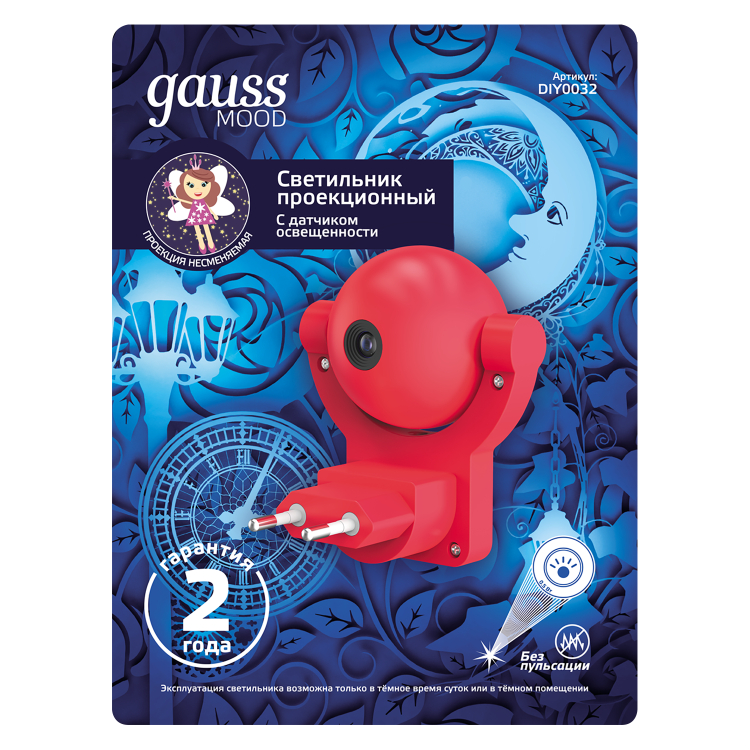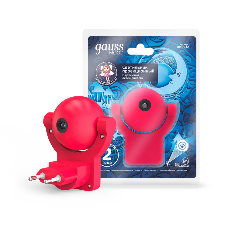 Светильник розеточный проекционный MOOD 0,5W - это детский ночник с датчиком освещенности, который выключается при ярком освещении или наступлении утра и может оставаться в розетке постоянно. Светильник розового цвета изготовлен из безопасного мягкого пластика, предназначенного для детских изделий. Он имеет статичное изображение и во включенном режиме демонстрирует проекцию феи. Светильник станет полезным помощником в борьбе с детской боязнью темноты.