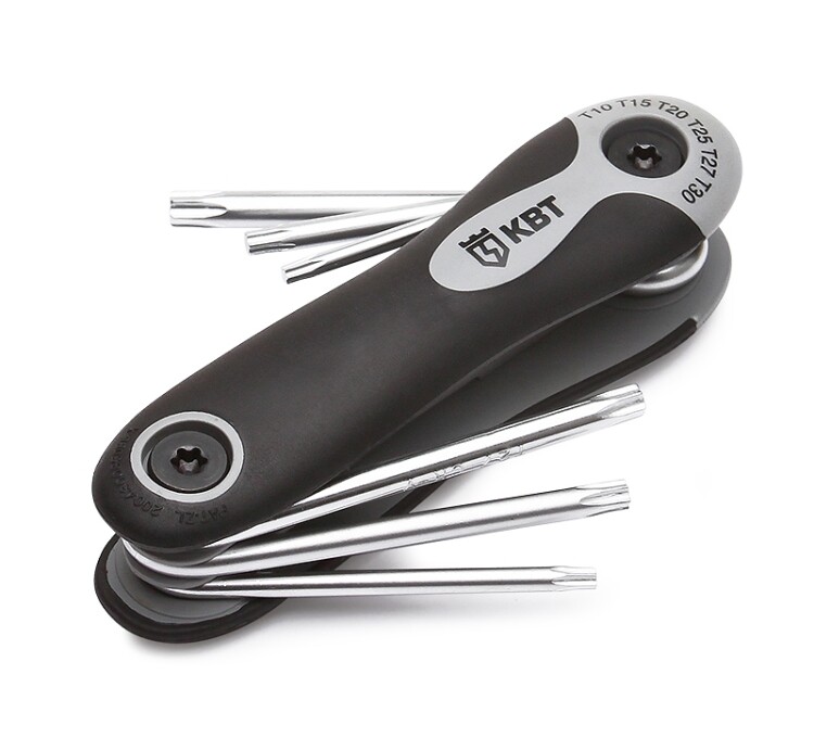 Набор складных ключей TORX в рукоятке. Для откручивания/закручивания винтов с внутренним профилем TORX (звездочка) Состав набора: ключи Т10/Т15/Т20/Т25/Т27/Т30 Материал ключей: хром-ванадиевая сталь Двухкомпонентная эргономичная рукоятка с нескользящими вставками Длина рукоятки: 115 мм Вес: 105 г