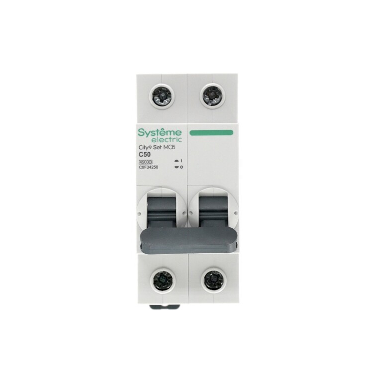 Автоматический выключатель серии City9 Set Systeme Electric, 2-полюсный, номинальный ток 50 А, характеристика С, Icn = 4.5 кА. Примен яется в электрических сетях напряжением 230 В. Предназначен для защиты от перегрузок и токов короткого замыкания. Оснащен механизмом «мгновенной коммутации». Ударопрочный корпус из специального пластика с 6 металлическими заклепками. Безопасные клеммы исключают попадание кабелей в заклеммное пространство (ранее Schneider Electric Easy9 EZ9F34250).
