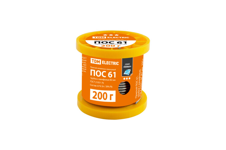Припой ПОС 61, трубка с канифолью, ГОСТ 21931-76, ?2 мм, 200 г, катушка, серия "Алмаз" TDM (кр.10шт) !Акция