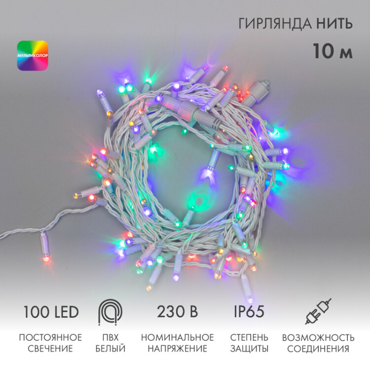 Гирлянда светодиодная Нить 10м 100 LED МУЛЬТИКОЛОР белый ПВХ IP65 постоянное свечение 230В соединяется нужен блок 303-500-1 NEON-NIGHT (кр. 1 шт)