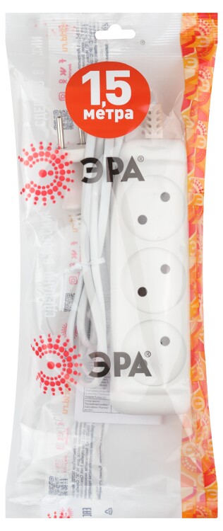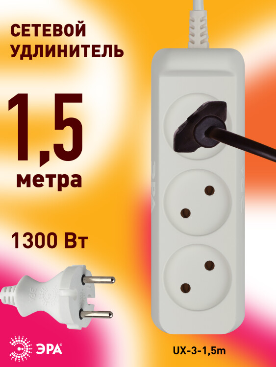 Бытовой удлинитель ЭРА UX-3-1,5m на 3 розетки, без заземления. Рассчитан для подключения простых бытовых приборов стандартной мощности. Гибкий двухжильный провод ШВВП длиной 1,5 метра.Максимальная нагрузка - 6 A/ 1300 Вт. Базовый белый цвет, аккуратный дизайн с закруглёнными углами. Для комфорта и безопасности гнёзда слегка "утоплены" в корпус. Изготовлен из надёжного полипропилена со специальными антипиренами, препятствующими горению.