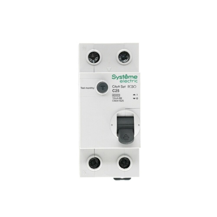 Автоматические выключатели дифференциального тока (АВДТ) серии City9 Set Systeme Electric,1P+N, номинальный ток 25 А, характерис тика С, Icn = 4.5 кА, ток утечки 10 мА, тип А. АВДТ применяется в электрических сетях напряжением 230В. Предназначен для защиты сети от перегрузок, людей от поражения электрическим током и токов короткого замыкания. Уставка по току утечки 10 мА обеспечивает гарантированную защиту людей при прямом прикосновении. Кнопка тест обеспечивает проверку работоспособности аппарата. Крепление на DIN-рейку шириной 35 мм. Безопасные клеммы.