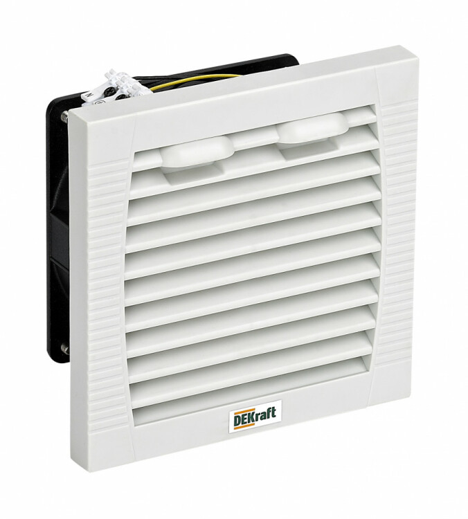 Вентилятор (с фильтром или без него) всасывает свежий воздух снаружи внутрь корпуса, создавая тем самым небольшое избыточное давление, которое приводит к удалению горячего воздуха через выпускную решетку. Циркуляция воздуха гомогенизирует температуру, а избыточное давление помогает предотвратить попадание пыли. Крепление сбоку или на крыше. Может комбинироваться с термостатом. Вентиляторы состоят из осевого двигателя, защитного кожуха на передней и задней поверхностях и фильтра, предназначенного для удержания частиц пыли. Этот фильтр может быть заменен во время работы без риска контакта с вращающимся элементом. Внешняя температура не должна превышать 35°C и должна быть более чем на 5°C ниже требуемой температуры в корпусе. Фильтры, которыми оснащены вентиляторы, необходимо регулярно чистить и заменять. При определении расхода вентилятора учитывайте потери давления, вызванные выпускным элементом (решеткой с фильтром, вентиляционной решеткой или простым отверстием).