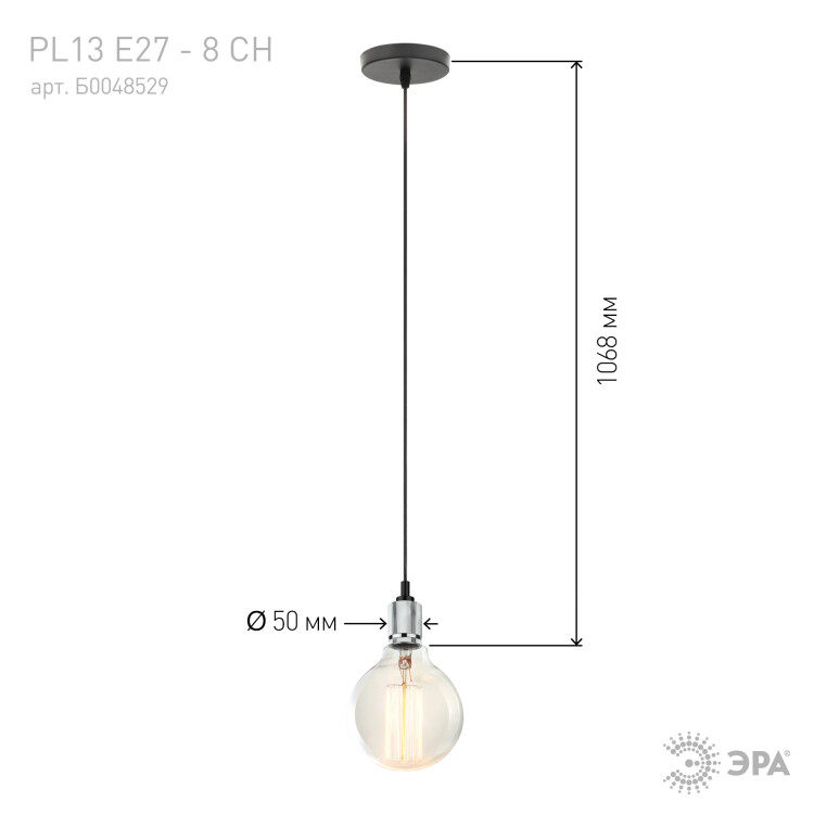 Светильник подвесной PL13 E27 - 8 CH является унив ерсальным источником света, легко монтируется и демонтируется в потолок. Создает неповторимый дизайн и уют в помещении. Подходит для спален, гостинной, столовой и других комнат. Цоколь для источника света E27, напряжение питания 220В ~50/60Гц, материал алюминий, цвет светильника хром, размер плафона H50*D107+1000 длинна провода, максимальная мощность лампы 50 Вт, степень защиты IP20