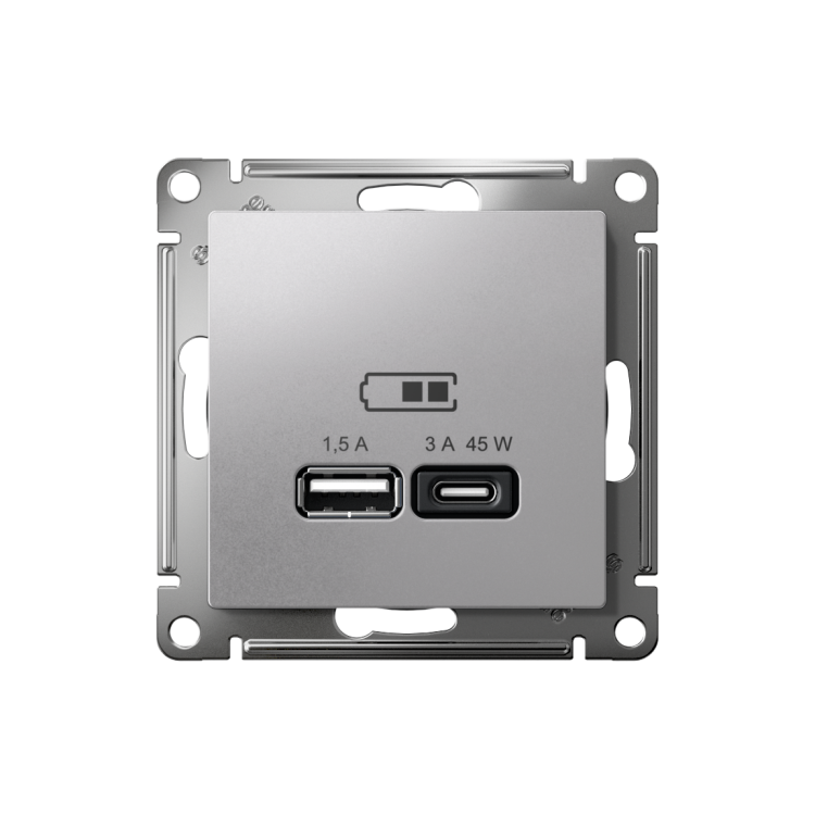 Розетка Systeme Electric (ранее Schneider Electric) серии AtlasDesign в цвете алюминий двойная USB с разъемами типа A+C высокоскоростная. Самая современная USB-зарядка с двумя разъемами позволяет заряжать как стандартные мобильные устройства через разъем типа А, так и новейшие устройства с разъемом типа С. Позволяет заряжать смартфоны последнего поколения, которые поддерживают функцию быстрой зарядки. Мощность: тип-A – 7.5 Вт, тип-С - 45Вт. Поддерживает современные протоколы быстрой зарядки QC, PD, последних версий. Лицевые детали из качественного ABS-пластика, устойчивого к царапинам и УФ-излучению.