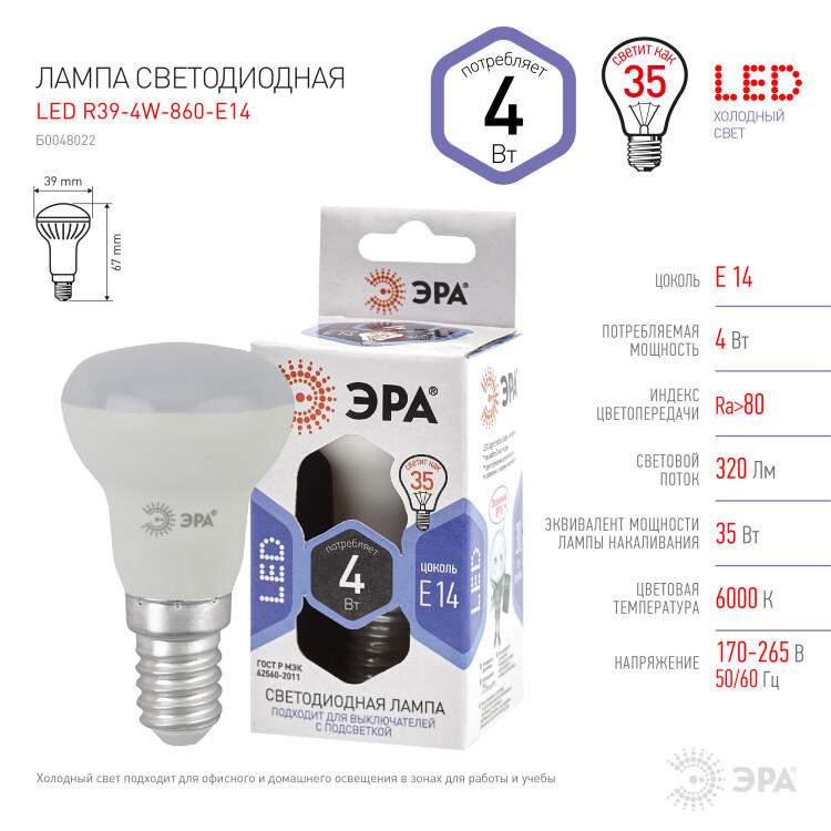 Лампочка светодиодная ЭРА STD LED R39-4W-860-E14 Е14 / Е14 4Вт рефлектор холодный дневной свет (кр. 1шт)