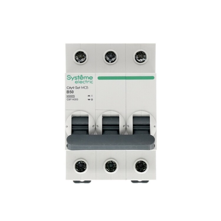 Автоматический выключатель серии City9 Set Systeme Electric, 3-полюсный, номинальный ток 50 А, характеристика B, Icn = 4.5 кА. Применяется в электрических сетях напряжением 400 В. Предназначен для защиты от перегрузок и токов короткого замыкания. Оснащен механизмом «мгновенной коммутации». Ударопрочный корпус из специального пластика с 6 металлическими заклепками. Безопасные клеммы исключают попадание кабелей в заклеммное пространство (ранее Schneider Electric Easy9 EZ9F14350).