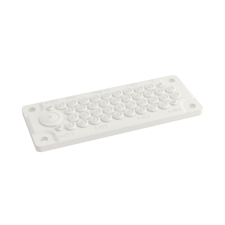 Мембранный кабельный ввод FL21 изготавливается из термопластичного эластомера, категория стойкости к горению – ПВ-0 (V-0), цвет RAL7035. Диапазон рабочих температур – от -40 до +130 °С, IP65, 43 отверстия.