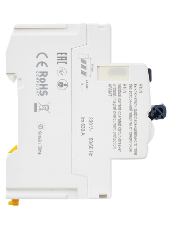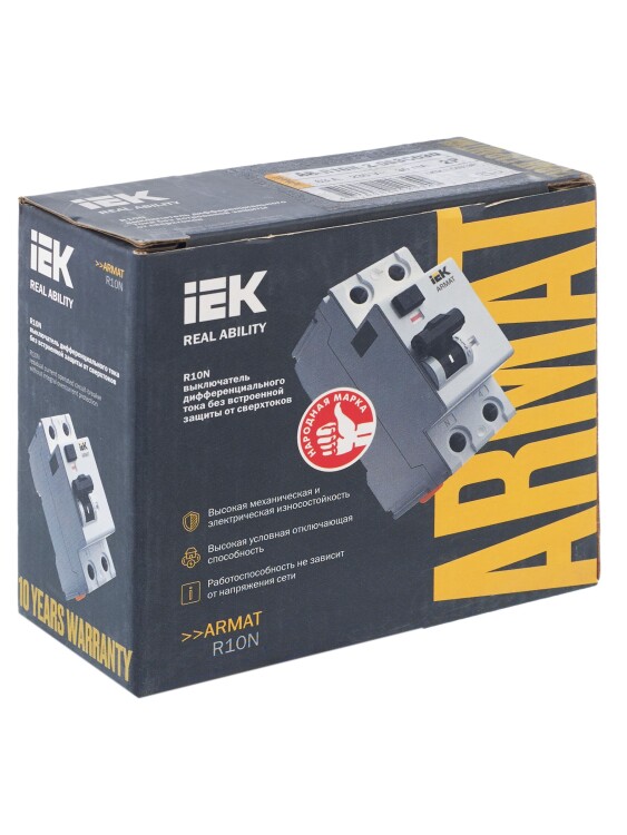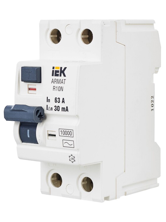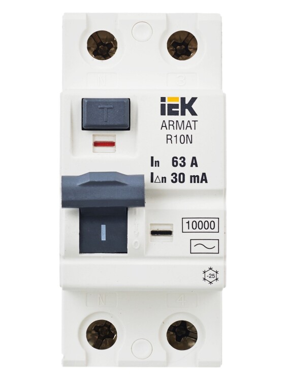 Выключатели дифференциального тока ARMAT серии R10N выполняют функцию защиты поражения человека электрическим током, а так же защиты от пожара при возникновении замыкания на землю. Модельный ряд включает в себя устройства с типами защитных характеристик по дифференциальному току AC, A, AC-S, A-S; номинальными токами от 25 до 100 А; номинальными дифференциальными токами срабатывания от 10 до 300мА. Условная отключающая способность ВДТ ARMAT серии R10N составляет 10 кА.