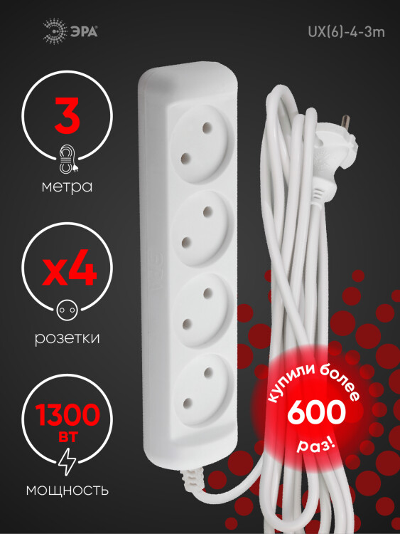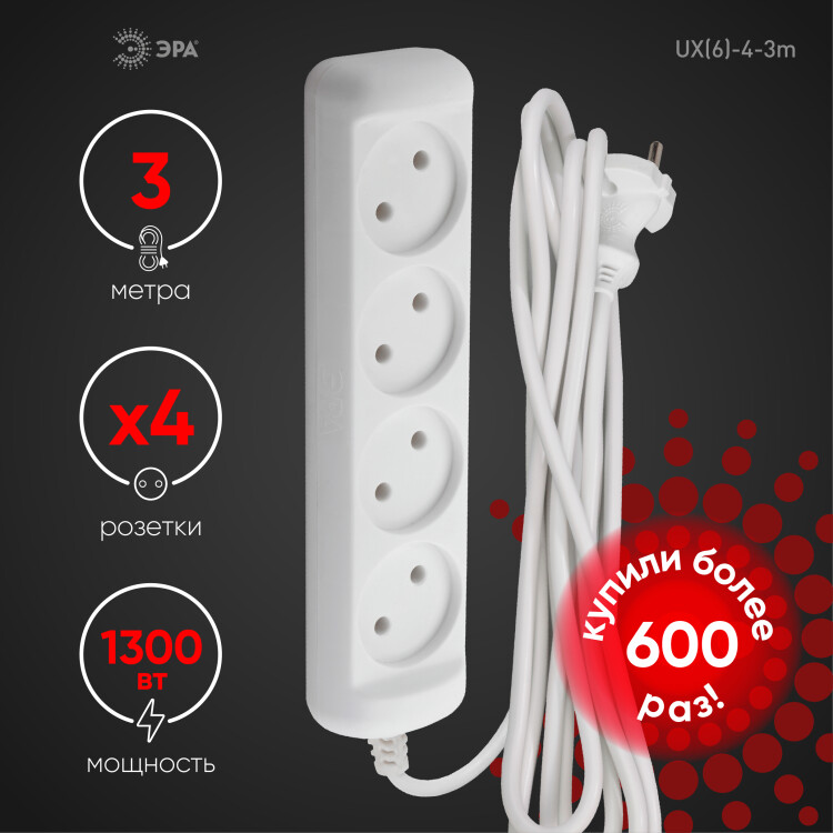 Удлинитель электрический Эра UX(6)-2-3m без зазе мления, ПВС, 2x0,75мм2, 2 розетки, 3 м. Рассчитан на максимальную мощность 6А/1300Вт. Удлинитель Эра станет Вашим надежным помощником, если Ваши любимые электроприборы находятся далеко от розеток. Модель удлинителя на 6А позволяет подключить бытовые приборы общей нагрузкой до 1300Вт. Дизайн удлинителя разработан в России командой Эра Style.