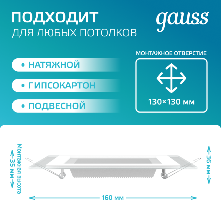 Светильники с декоративным стеклом от Gauss обеспечивают комфортное и экономичное освещение в помещениях разного назначения. Такие потолочные светодиодные светильники обладают лаконичным дизайном и компактными размерами, поэтому гармонично впишутся в любой интерьер. Эти осветительные приборы можно использовать при монтаже любых натяжных конструкций, создавая желаемую атмосферу в помещении. Светильники с декоративным стеклом от Gauss идеально подходят в качестве дополнительного или акцентного освещения на кухнях, в гостиных, санузлах, для выделения объектов на витринах магазинов, в кафе или других коммерческих учреждениях. При создании разноуровневых конструкций с точечным светодиодным освещением можно визуально увеличить пространство в помещении, создать нужную атмосферу для работы или отдыха.