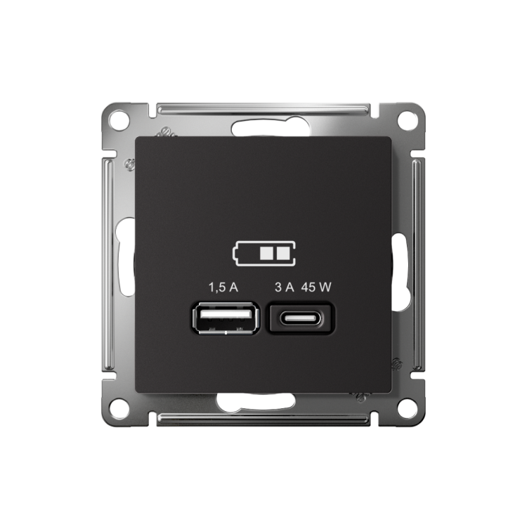 Розетка Systeme Electric (ранее Schneider Electric) серии AtlasDesign в цвете карбон двойная USB с разъемами типа A+C высокоскоростная. Самая современная USB-зарядка с двумя разъемами позволяет заряжать как стандартные мобильные устройства через разъем типа А, так и новейшие устройства с разъемом типа С. Позволяет заряжать смартфоны последнего поколения, которые поддерживают функцию быстрой зарядки. Мощность: тип-A – 7.5 Вт, тип-С - 45Вт. Поддерживает современные протоколы быстрой зарядки QC, PD, последних версий. Лицевые детали из качественного ABS-пластика, устойчивого к царапинам и УФ-излучению. Благодаря покрытию «soft touch» к изделию приятно прикасаться.