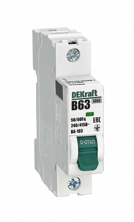 Автоматический выключатель серии ВА-103 NEW DEKraft; 1P; номинальный ток 63 А; характеристика B; отключающая способность 6 кА, что позволяет использовать аппараты в качестве вводных. 5 монолитных заклепок повышают прочность корпуса аппарата. Окошко-индикатор всегда показывает состояние контактов вне зависимости от положения рукоятки управления. Боковые каналы охлаждения повышают стабильность работы при высоких температурах окружающей среды. Есть возможность установки дополнительных аксессуаров с левой стороны устройства. Аппарат на 100% совместим с корпусами и оболочками DEKraft, Systeme Electric.