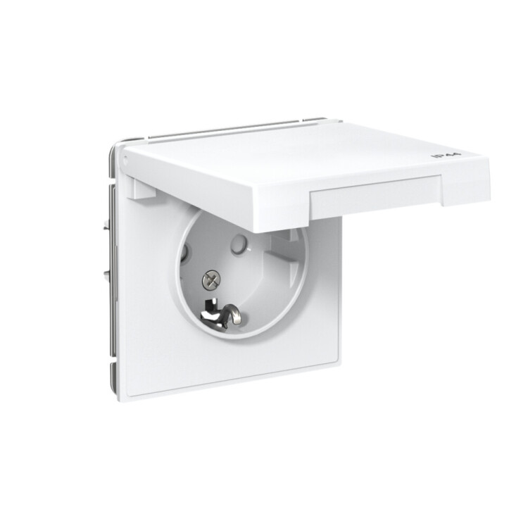 Механизм Systeme Electric серии ArtGallery Aqua в цвете белый розетки одинарной с заземлением, шторками и крышкой подходит для сетей 250 В, на ток 16 А.