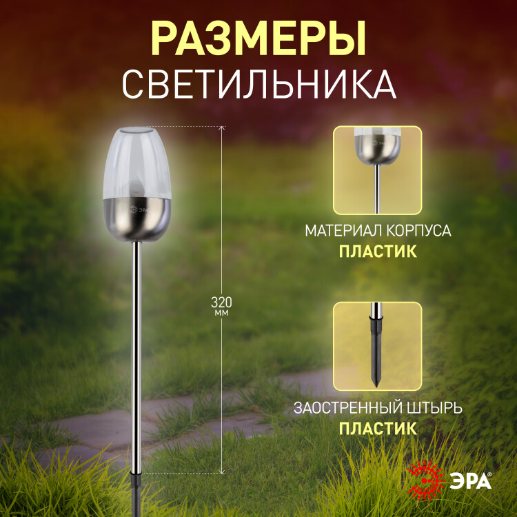 Фигурка садовая декоративная ЭРА ERASF22-37 "Идеал" станет элегантным украшением вашего загородного дома. Этот уличный светодиодный светильник легко втыкается в землю - его можно разместить в саду, украсить им пруд, альпийскую горку, подсветить тропинку или периметр участка. Садовый фонарь высотой 32 см выполнен из металла серебристого цвета и прозрачного пластика. Беспроводной светильник работает на солнечной батарее, этот тип получения энергии является самым экологичным, энергоемким, а также бесшумным. Питание происходит во включенном режиме в солнечную погоду, фигурка автоматически включается с наступлением ночи и работает до 8 часов. Имитация горения свечи и мягкий свет сделают ваш вечер теплым и изысканным.