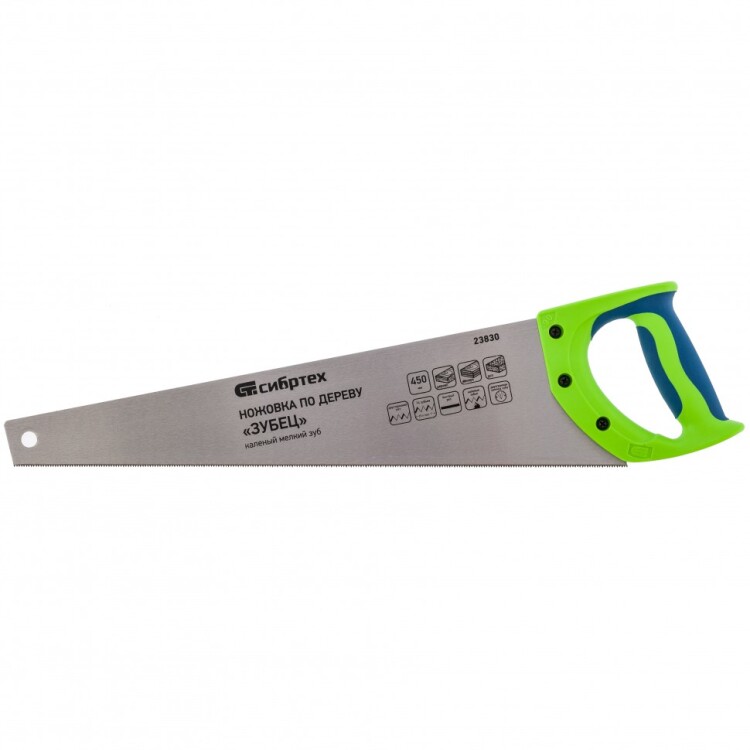 Используется при продольном и поперечном пилении древесины. _x000D__x000D_ _x000D__x000D_ Полотно инструмента изготовлено из углеродистой стали марки 65Г и имеет зуб с двухгранной заточкой. _x000D__x000D_ Количество зубьев на дюйм – 14. _x000D__x000D_ Зубья ножовки закалены. _x000D__x000D_ Двухкомпонентная рукоятка изготовлена из ударопрочного обрезиненного пластика, крепится тремя винтами к полотну. _x000D__x000D_ _x000D__x000D_
