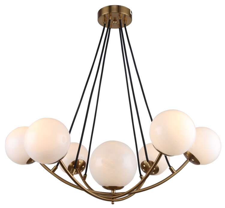 Оригинальная дизайнерская люстра Rivoli Dina под 7 ламп – арт. 4099-307. Подвесные люстры – актуальное решение для современного интерьера. Для люстры Dina нужно купить лампочки Е14 40 Вт, 7 шт. Люстра потолочная Rivoli Dina хорошо осветит площадь 35 м2. Такие люстры идеально подходят в загородный дом, хороши для освещения больших пространств с высокими потолками. Минималистичная арматура люстры окраш ена в красивый цвет латуни. Окрашивание гальваническое – люстра сохранит свою красоту на долгие годы.