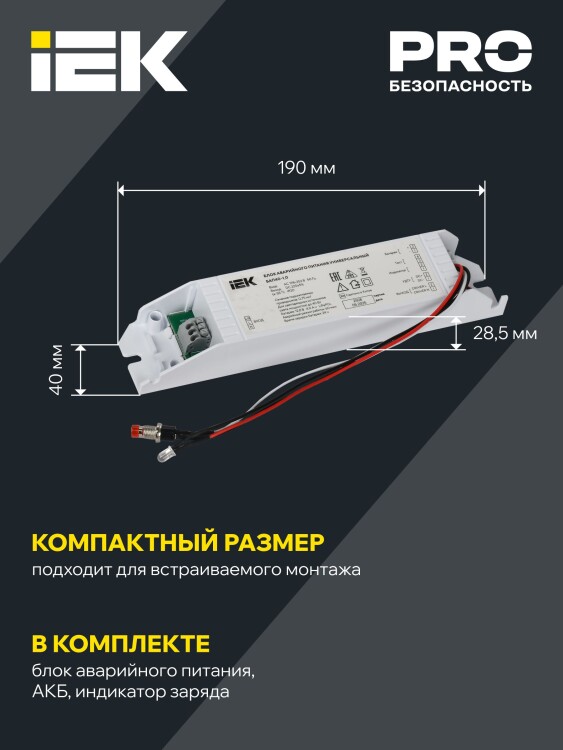 Блок аварийного питания IEK состоит из электронного пускорегулирующего аппарата (конвертера), герметичной никель-кадмиевой аккумуляторной батареи, светодиодного индикатора наличия сети и подзарядки аккумулятора с кнопкой "ТЕСТ".