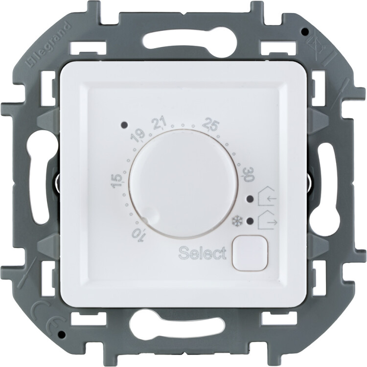 Термостат для теплого пола Legrand Inspiria с выносным датчиком в комплекте, максимальный ток 16 А, напряжение ~230 В, цвет "Белый". Используется для измерения температуры и управления контуром электрического теплого пола в помещениях. Особенности изделия: - Полностью укомплектован и готов к установке и работе. Выносной датчик температуры пола в комплекте (длина 4 метра). - Высокий максимальный ток 16 А позволяет напрямую управлять значительными по площади контурами электрического теплого пола. - Оснащен режимами работы "Я дома"/"Я вне дома", что помогает экономить электроэнергию и расходы в различные периоды активности дома. - Оснащен индикацией обрыва датчика температуры для мгновенного определения причины неисправности термостата. - Широкий диапазон уставок температуры от 7 до 50 °С. - Лицевая панель изготовлена из качественного пластика ABS, устойчивого к загрязнению и воздействию УФ-излучения.