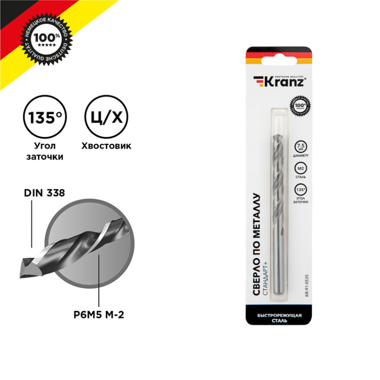 Сверло по металлу 7,5х109х69мм «Стандарт+» (P6M5 M-2) DIN 338, 1 шт. в блистере KRANZ (кр. 1 упак)