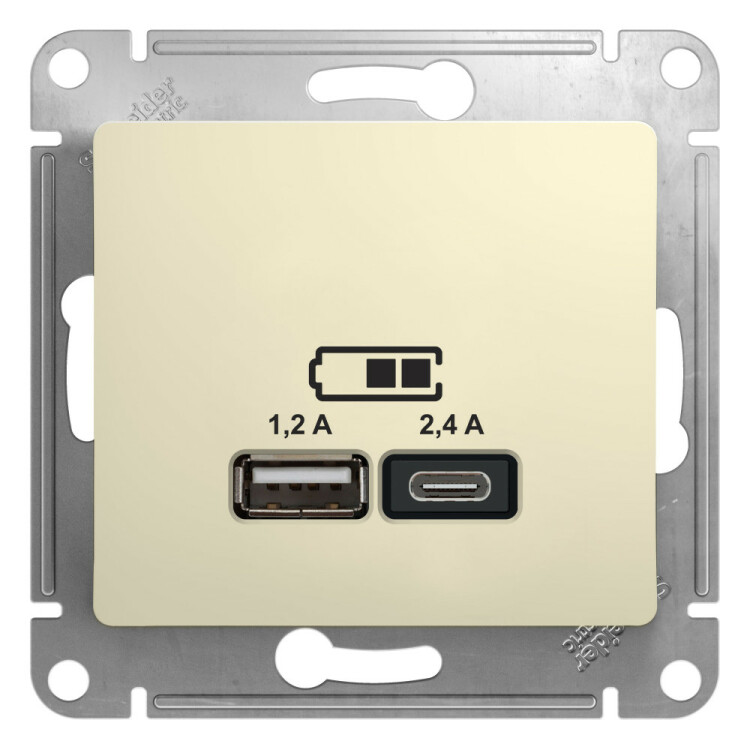 Розетка Systeme Electric (ранее Schneider Electric) серии Glossa (цвет бежевый) двойная USB с разъемами типа A+C. Выполнена из материала PС+ASA, стойкого к УФ-излучению и появлению царапин. Самая современная USB-зарядка с двумя разъемами позволяет заряжать как стандартные мобильные устройства через разъем типа А, так и новейшие устройства, в том числе ноутбуки, с разъемом типа С. (ранее Schneider Electric ЭУИ UNICA NEW NU501844)