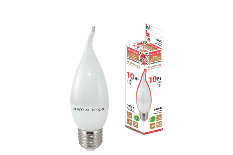 ЛампасветодиоднаяWFC37-10Вт-230В-3000К–E27(свечанаветру)Народная (кр.10шт)