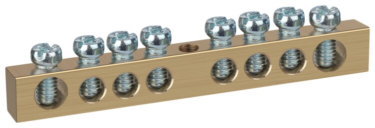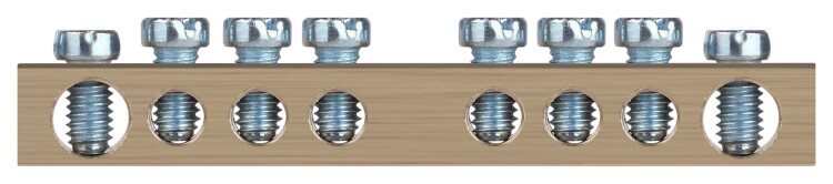 Шины латунные PEN "земля-ноль" применяются для электрического и механического соединения нулевых, защитных и фазных проводников в электрических щитах и распределительных устройствах. Изделия выполняются из латуни соответствующего сечения с отверстиями обладающими винтовыми зажимами для подключения проводников.
