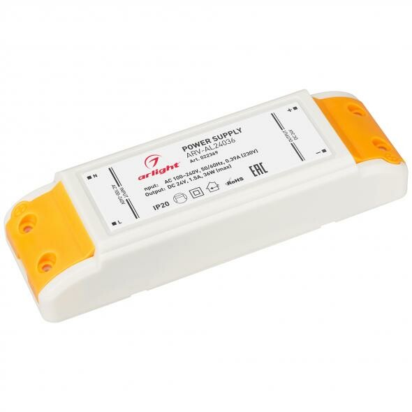 Блок питания с гальванической развязкой 24V, ток 1.5А, 36 Вт. Пластиковый корпус IP20. Вход: 100-240VAC. Размер 140х45х28 mm. Гарантия 2 года