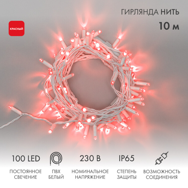 Гирлянда светодиодная Нить 10м 100 LED КРАСНЫЙ белый ПВХ IP65 постоянное свечение 230В соединяется нужен блок 303-500-1 NEON-NIGHT (кр. 1 шт)