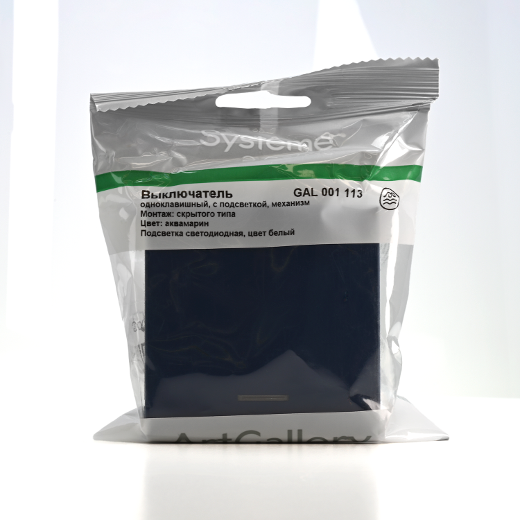 Механизм Systeme Electric серии ArtGallery в цвете аквамарин выключателя 1-клавишного с подсветкой подходит для с етей 250 В, на ток 10 А.