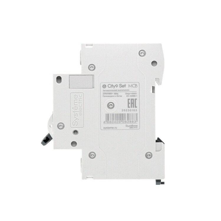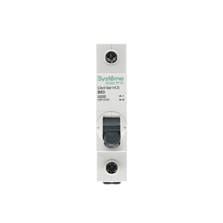 Автоматический выключатель серии City9 Set Systeme Electric, 1-полюсный, номинальный ток 63 А, характеристика B, Icn = 4.5 кА. Применяется в электрических сетях напряжением 230 В. Предназначен для защиты от перегрузок и токов короткого замыкания. Оснащен механизмом «мгновенной коммутации». Ударопрочный корпус из специального пластика с 6 металлическими заклепками. Безопасные клеммы исключают попадание кабелей в заклеммное пространство (ранее Schneider Electric Easy9 EZ9F14163).