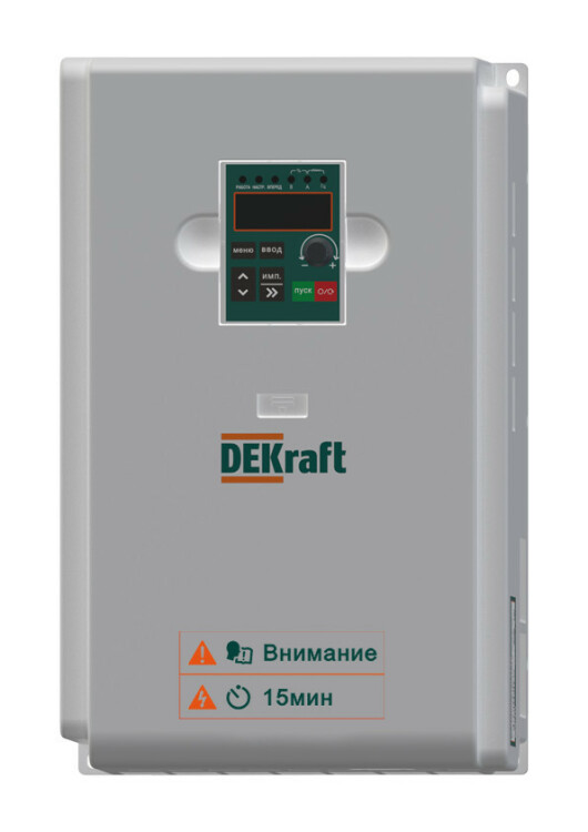 Преобразователи частоты ПЧ-510; Входное напряжение 380В 3 фазы; IP 20; тормозной модуль; Номинальные характеристики (P-тип): Un = 3Ф 400В; Pn = 11 кВт; In = 25 А. Перегрузочная способность (P-тип): 150% в течение 60 с, 180% в течение 3 с. Номинальные характеристики (G-тип): Un = 3Ф 400В; Pn = 15 кВт; In = 32 А. Перегрузочная способность (G-тип): 120% в течение 60 с, 150% в течение 3 с. Частотные преобразователи Dekraft представляют широкий спектр полностью протестированых и готовых к подключению решений для управления электродвигателями. Коммуникационный протокол: Modbus RTU. Встроенная функция пожарного режима. Съёмная LED панель оператора.