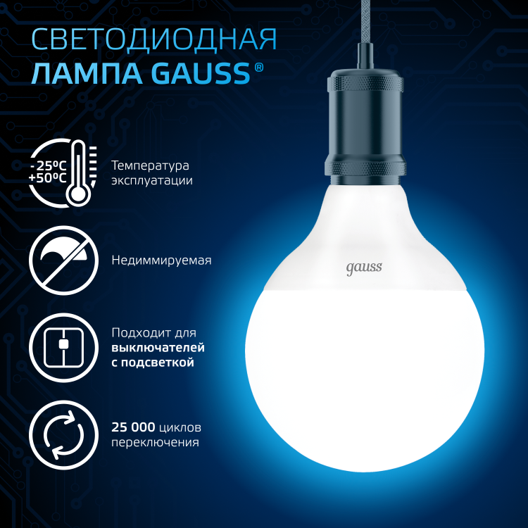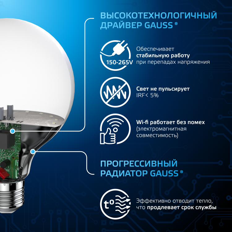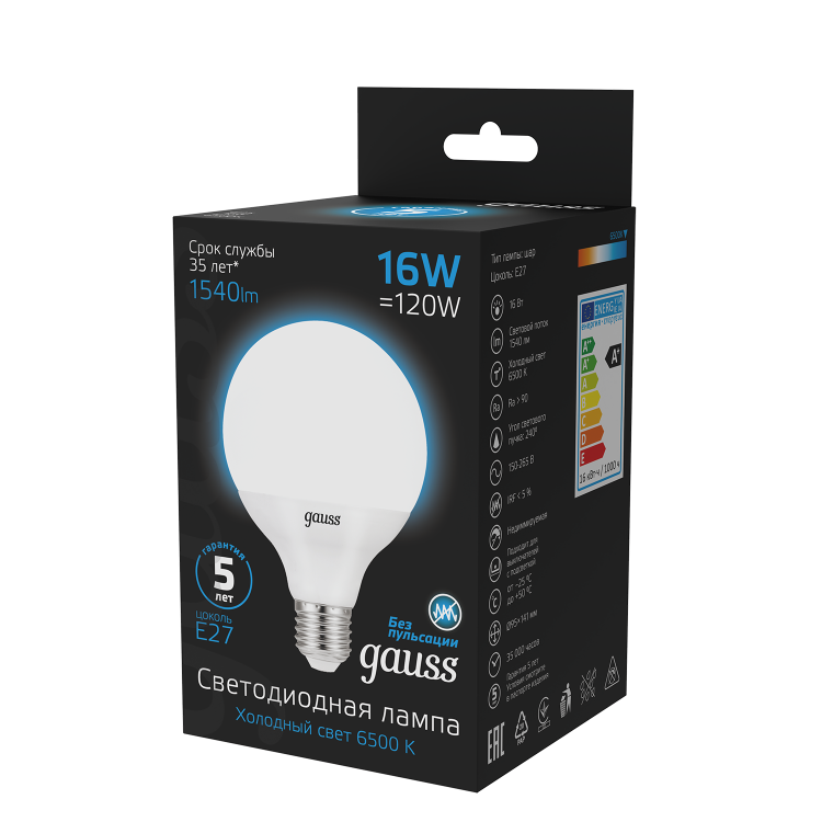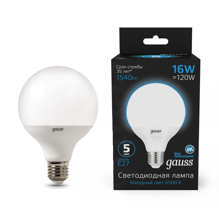 Премиальная серия ламп Gauss Black — надежные источники освещения высокого качества. Благодаря использованию качественных комплектующих и современных технологий лампы этой серии имеют один из самых высоких показателей энергоэффективности и долговечности. Уровень пульсации светового потока в светодиодных лампах Gauss ниже 5%, поэтому они создают комфортный и безопасный свет. Покупатель ламп серии black может быть уверен, что получает безопасный для глаз, яркий и комфортный свет. Передовые технологические решения обеспечивают стабильный световой поток даже при перепадах напряжения. Длительный срок гарантии — решение, основанное на уверенности в качестве продукции и ее долговечности.