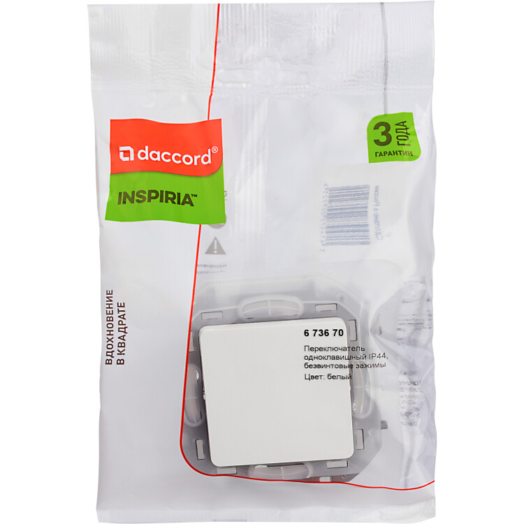 Переключатель одноклавишный IP44 скрытого монтажа Legrand/Daccord Inspiria, цвет "Белый", номинальный ток 10АХ, напряжение ~250В, безвинтовые зажимы.