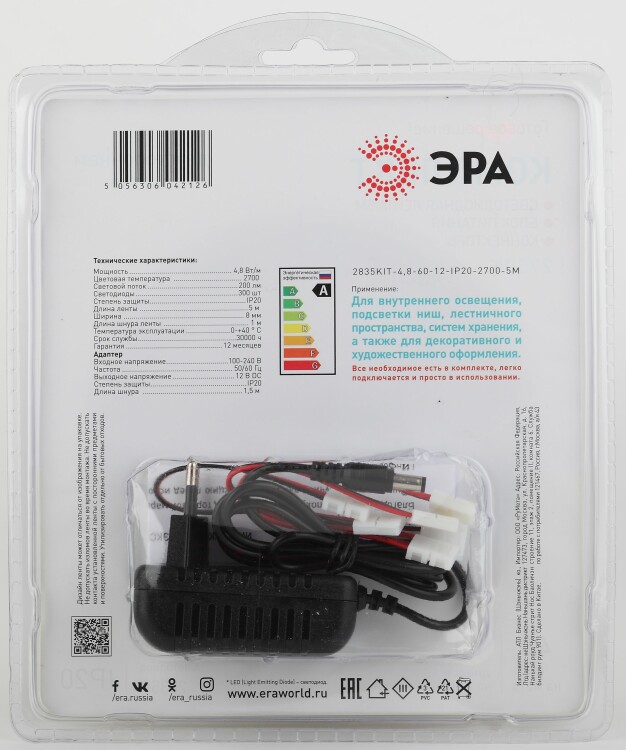 ЭРА Комплект светодиодной ленты 2835kit-4,8-60-12-IP20-2700-5m (50/1200) со степенью защиты от пыли и влаги IP20 - современный способ создания внутреннего освещения, подсветки ниш, лестничного пространства, систем хранения, а также декоративного и художественного оформления любых объектов и форм в помещениях.