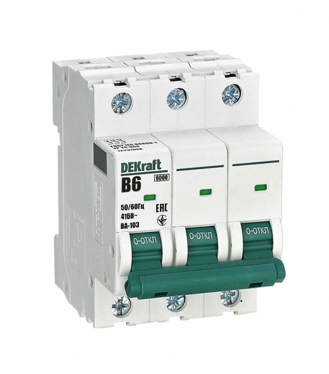 Автоматический выключатель серии ВА-103 NEW DEKraft; 3P; номинальный ток 6 А; характеристика B; отключающая способность 6 кА, что позволяет использовать аппараты в качестве вводных. 5 монолитных заклепок повышают прочность корпуса аппарата. Окошко-индикатор всегда показывает состояние контактов вне зависимости от положения рукоятки управления. Боковые каналы охлаждения повышают стабил ьность работы при высоких температурах окружающей среды. Есть возможность установки дополнительных аксессуаров с левой стороны устройства. Аппарат на 100% совместим с корпусами и оболочками DEKraft, Systeme Electric.