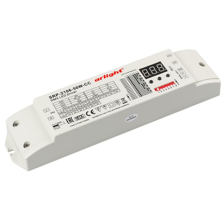 Декодер тока DMX для светильников. Ток (от 250 до 1500 мА) выставляется дип-перекл-лями на корпусе. Вход 220-240VAC, выход 250-1500mA 15-48VDC (в зависимости от вых. тока), мощн-ть 50W. Размеры 210x50x32 мм.