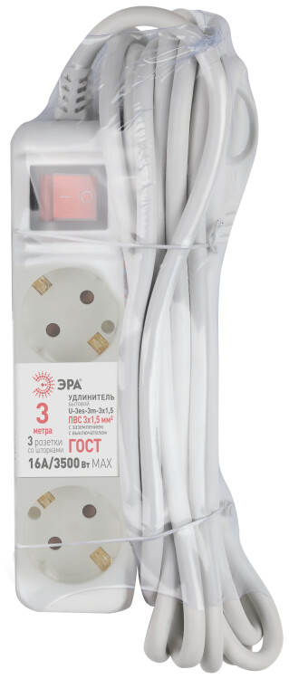 Удлинитель электрический Эра U-3es-5m-3x1,5 с зазе млением, с выключателем, 3 розетки, 5м ПВС 3x1,5мм2. Для мощных приборов. Рассчитан на максимальную мощность 16А/3500. Удлинитель Эра станет Вашим надежным помощником, если Ваши любимые электроприборы находятся далеко от розеток.